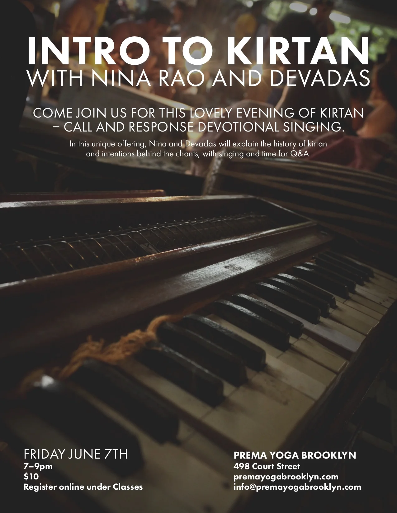 Come join us for this lovely evening of kirtan - call and response devotional singing. In this unique offering, Nina and Devadas will explain the history of kirtan and intentions behind the chants, with singing and time for Q&A.